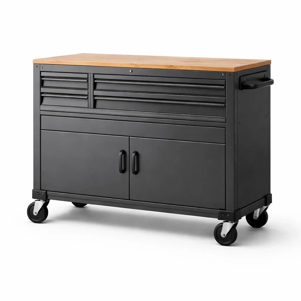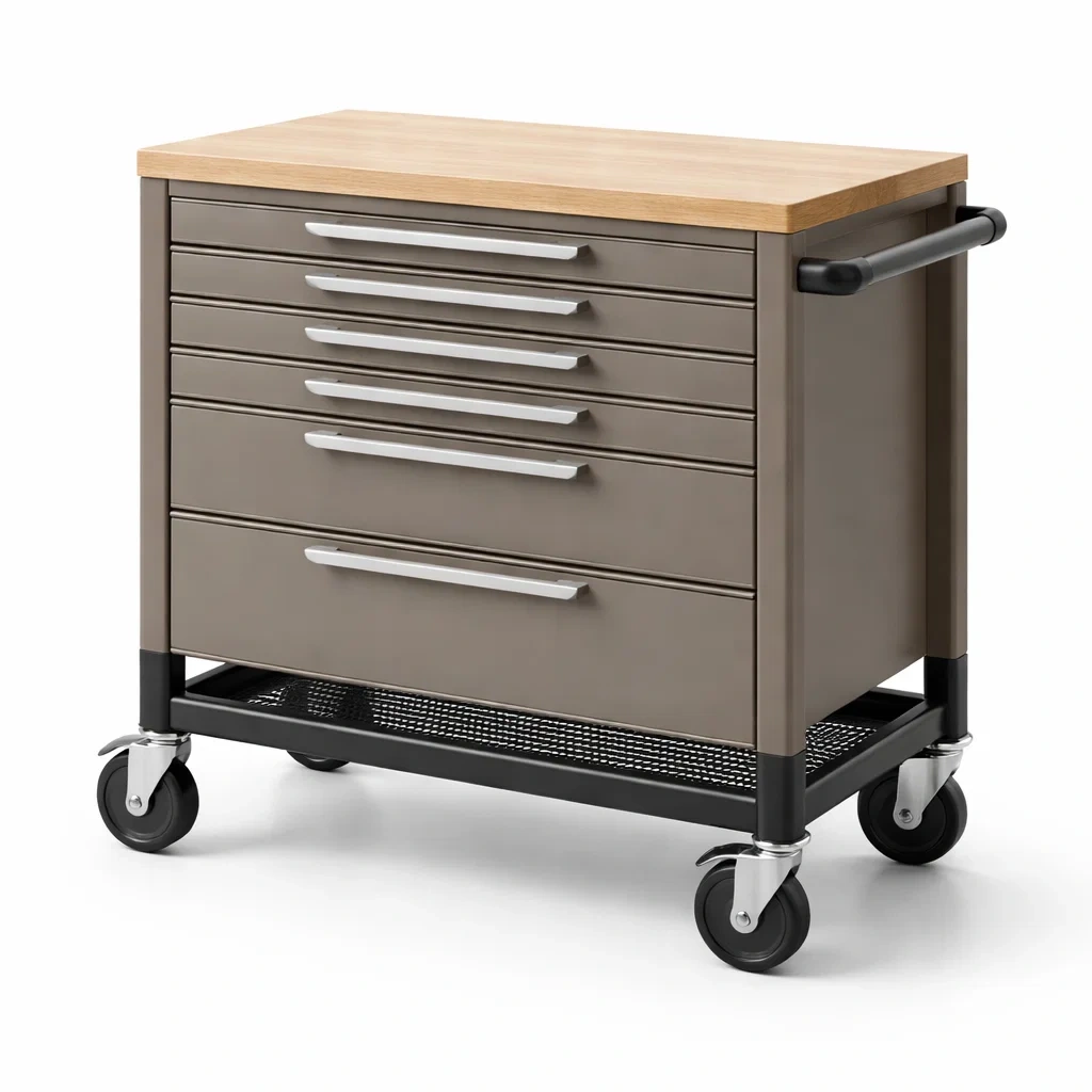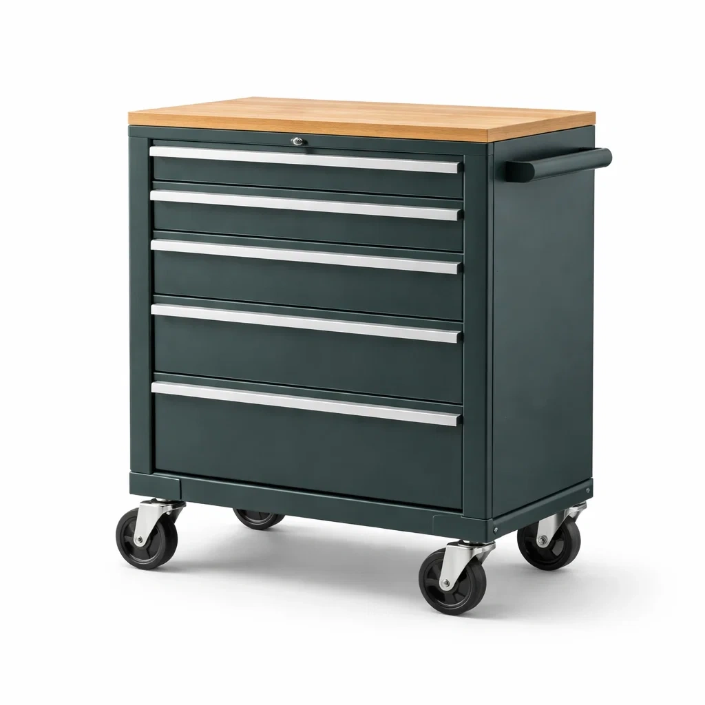 Chariot à outils de rangement en métal avec plateau en bois et 5 tiroirs