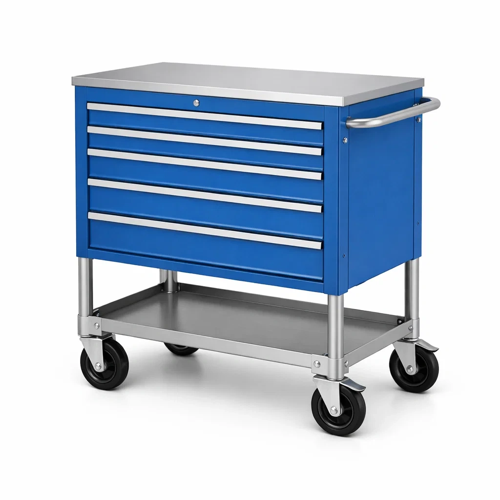 Chariot à outils en métal avec roulettes et 5 tiroirs bleu