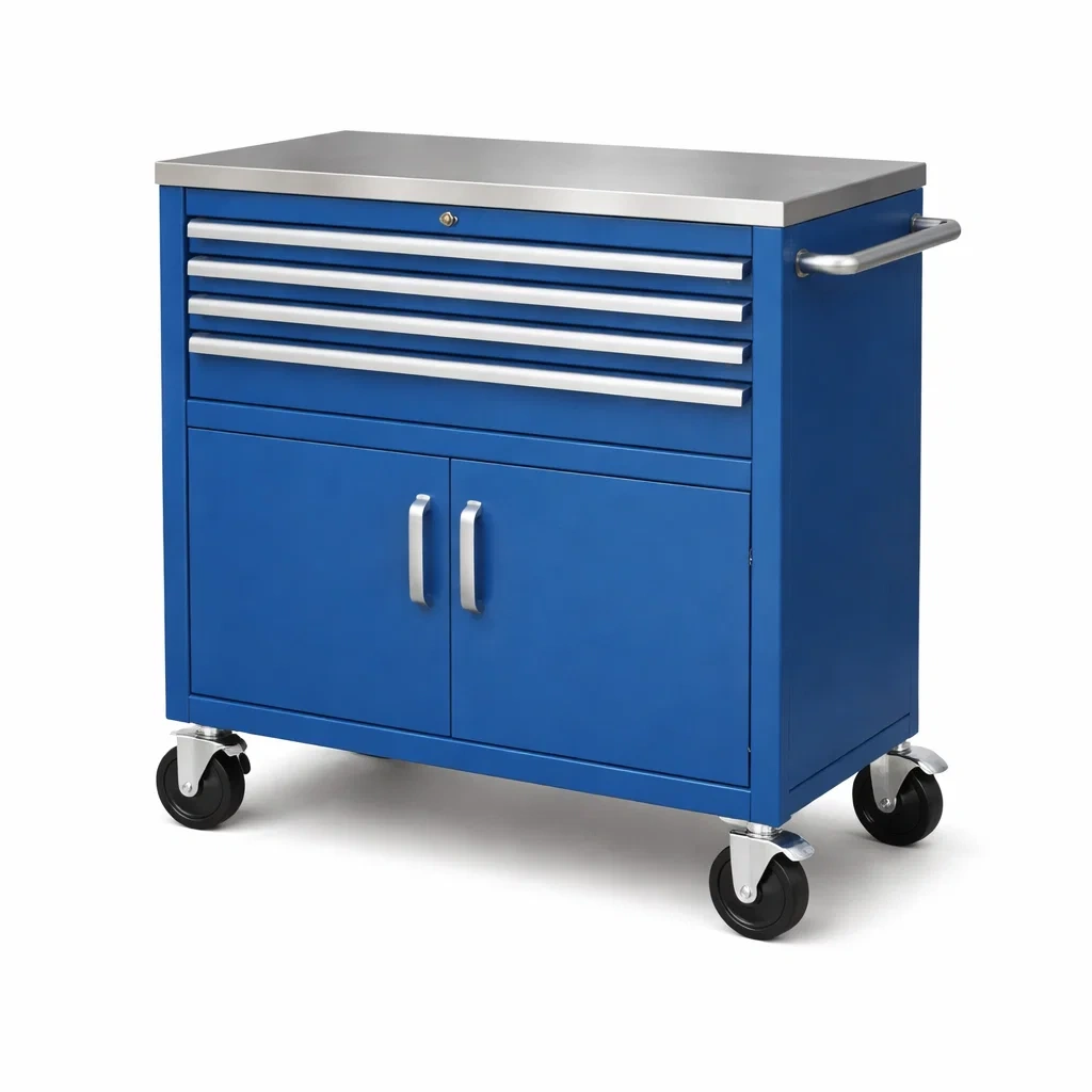 Ce chariot d'atelier est en métal robuste avec un plan de travail en acier inoxydable.