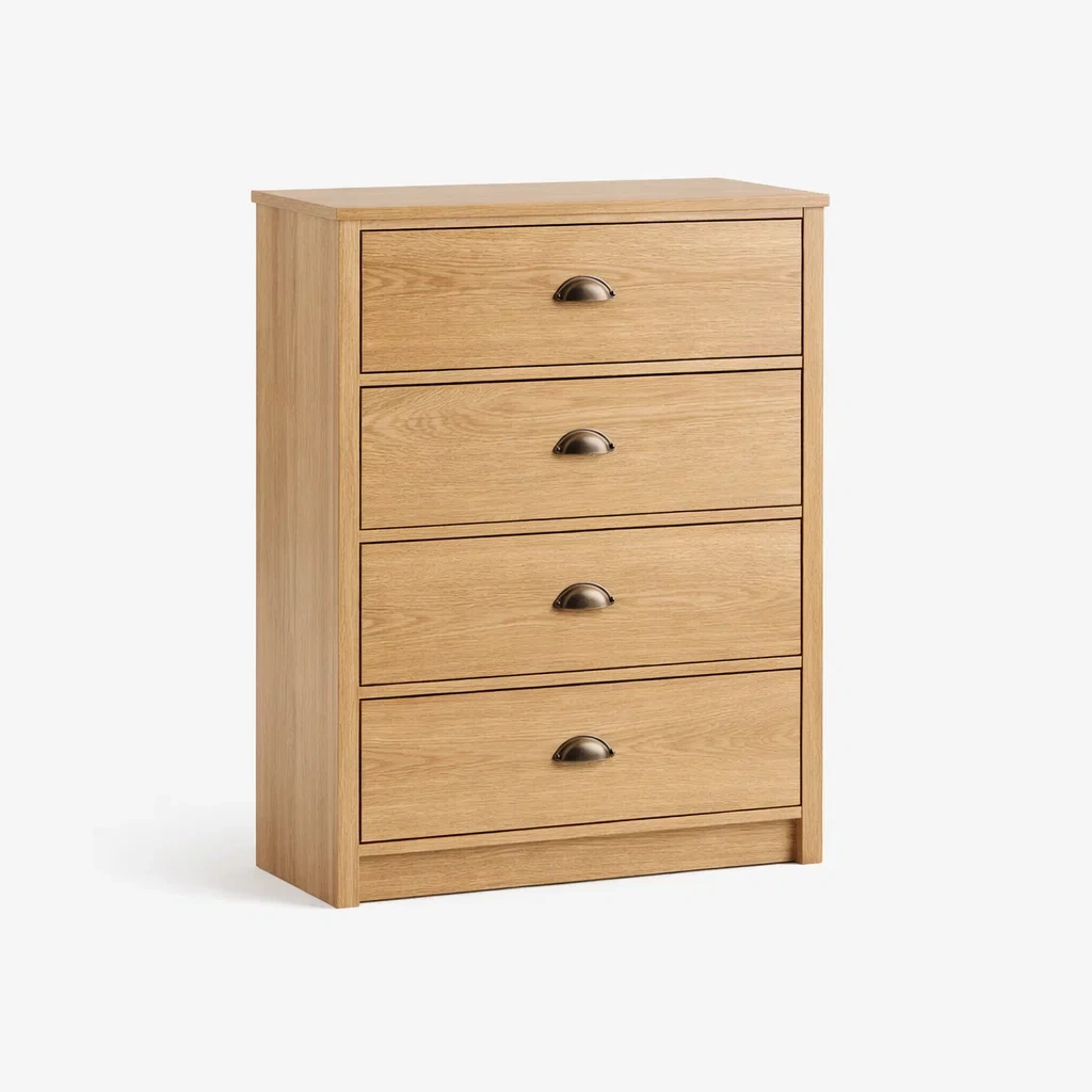 Commode 4 tiroirs en placage chêne avec poignées en métal