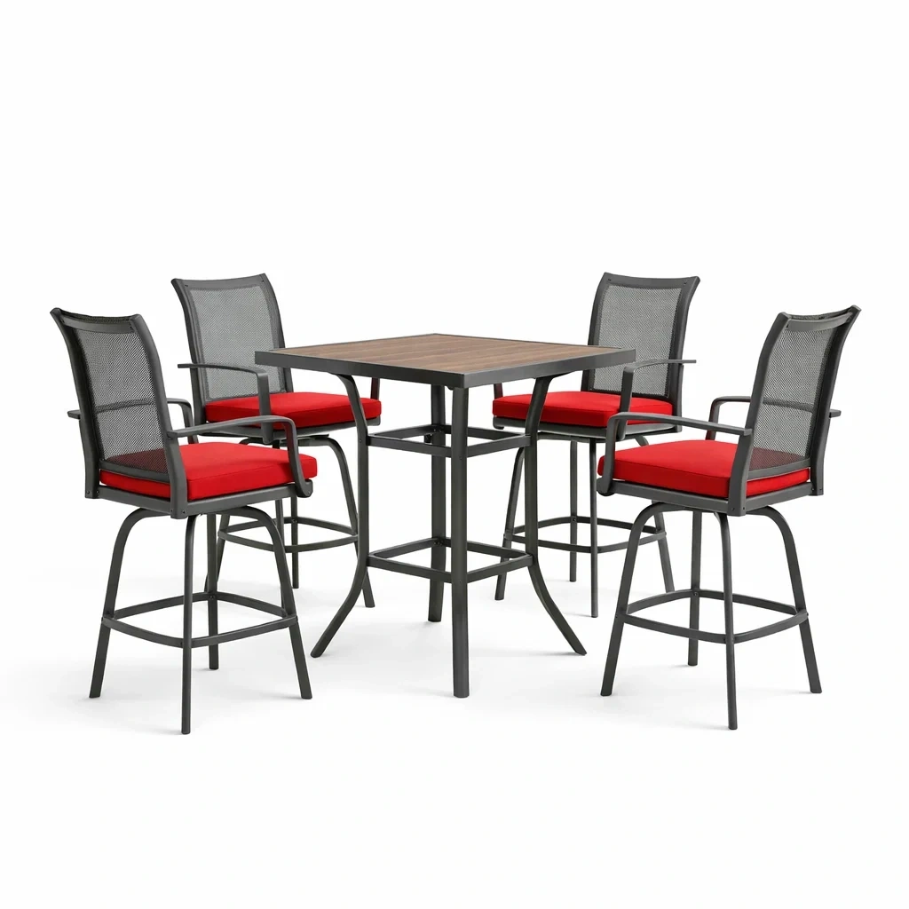 Ensemble de mobilier extérieur comprenant une table haute carrée et quatre chaises de bar.